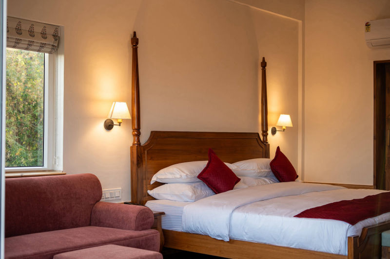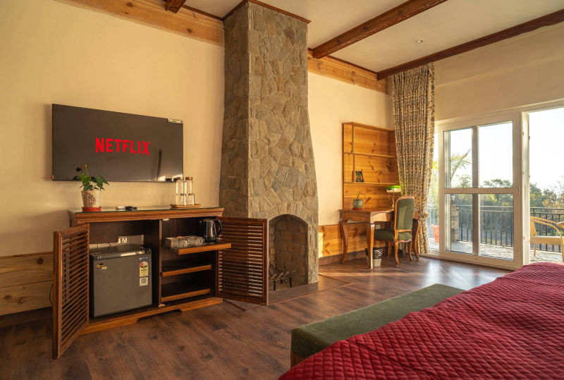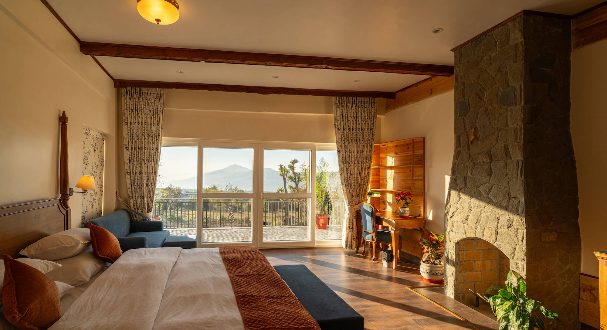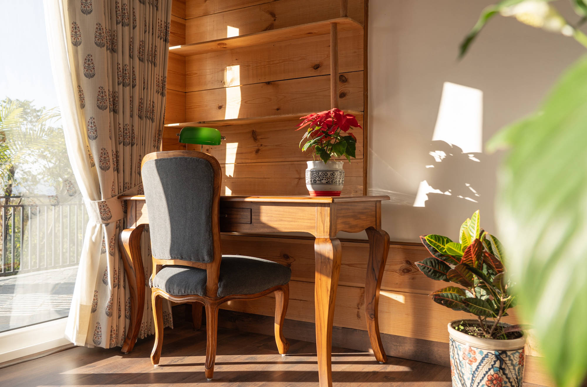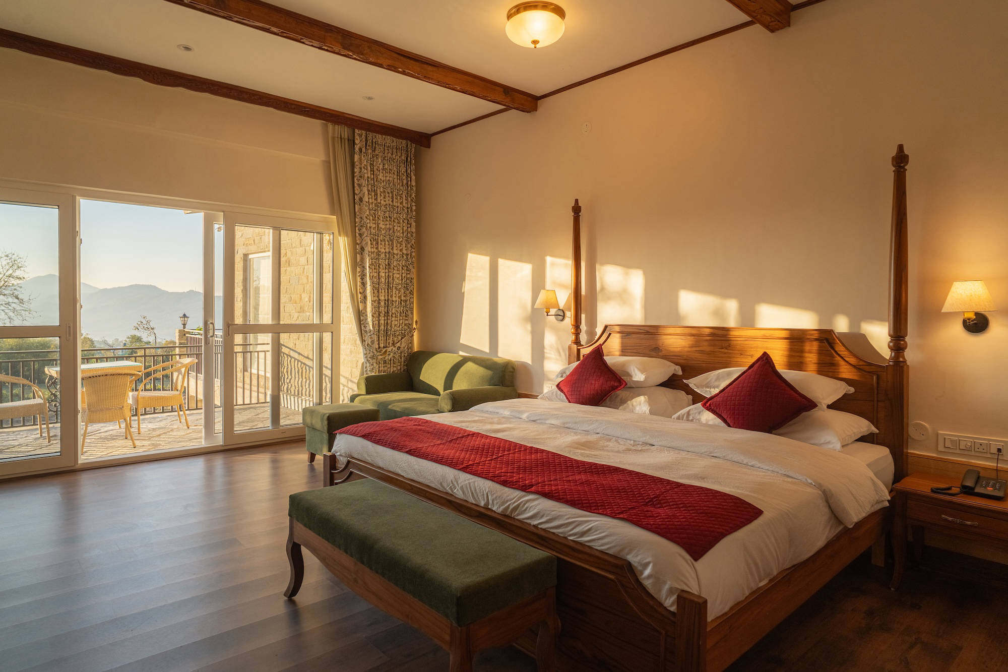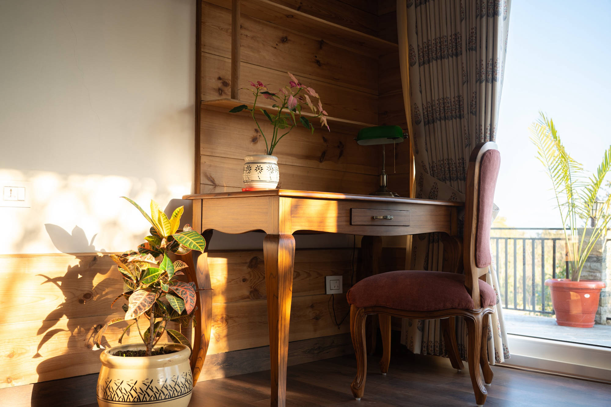 Wide windows and thoughtful orientation flood every room with natural light while ensuring unobstructed panoramas of the valley, forests and the vast Himalayan skyline. Enjoy your morning tea or unwind at sunset from your private balcony sit-out, furnished for comfort and quiet contemplation. A relaxing couch inside each room creates a perfect corner for reading, lounging or simply watching the mountains change through the day.