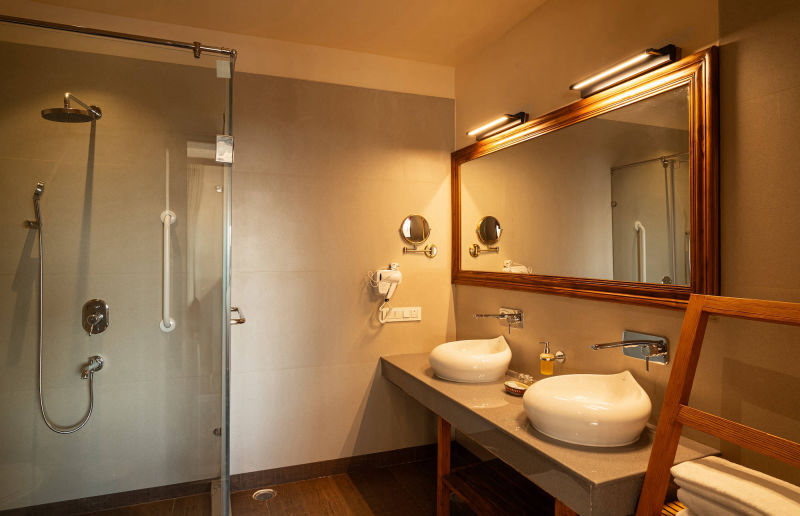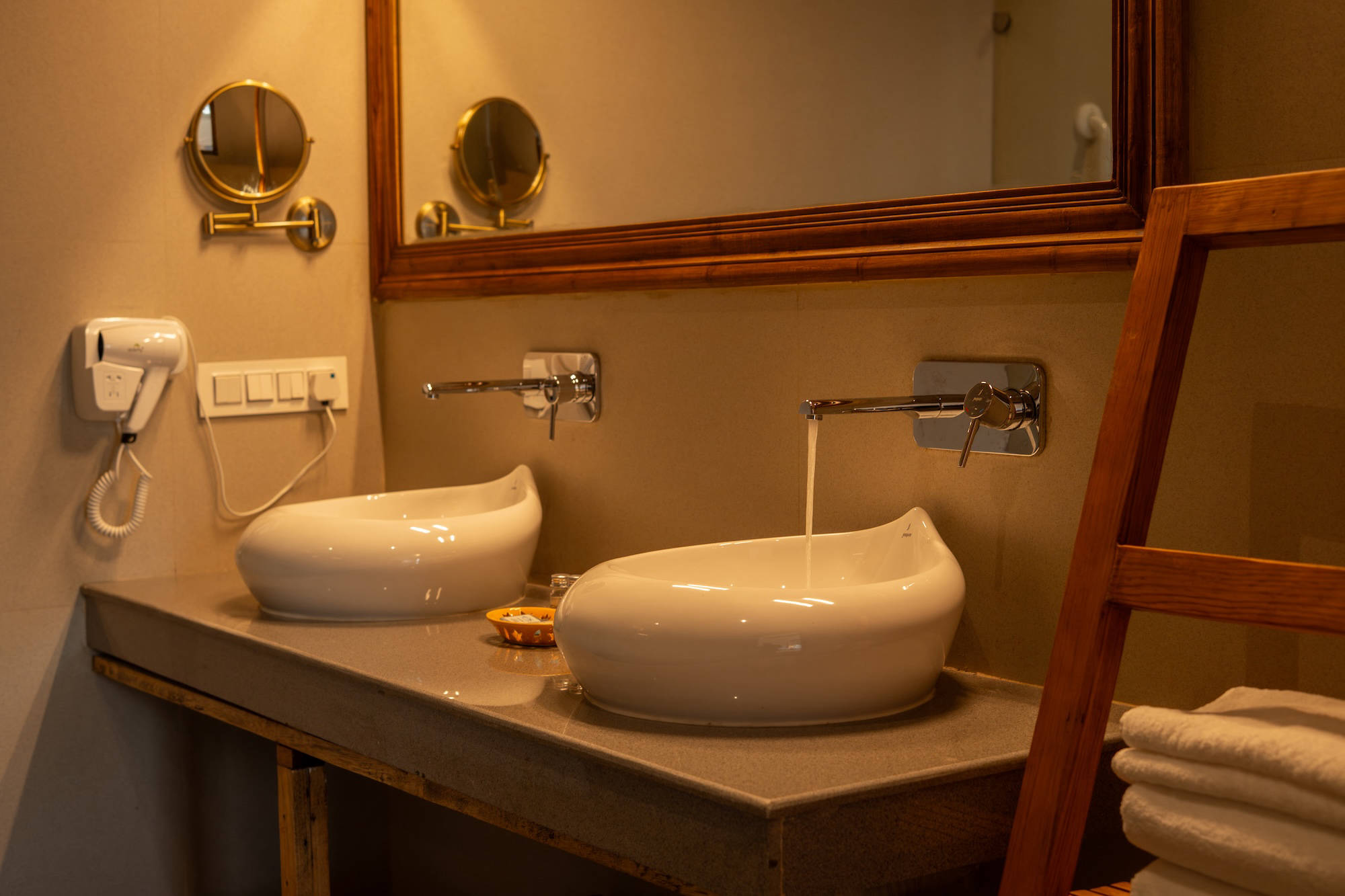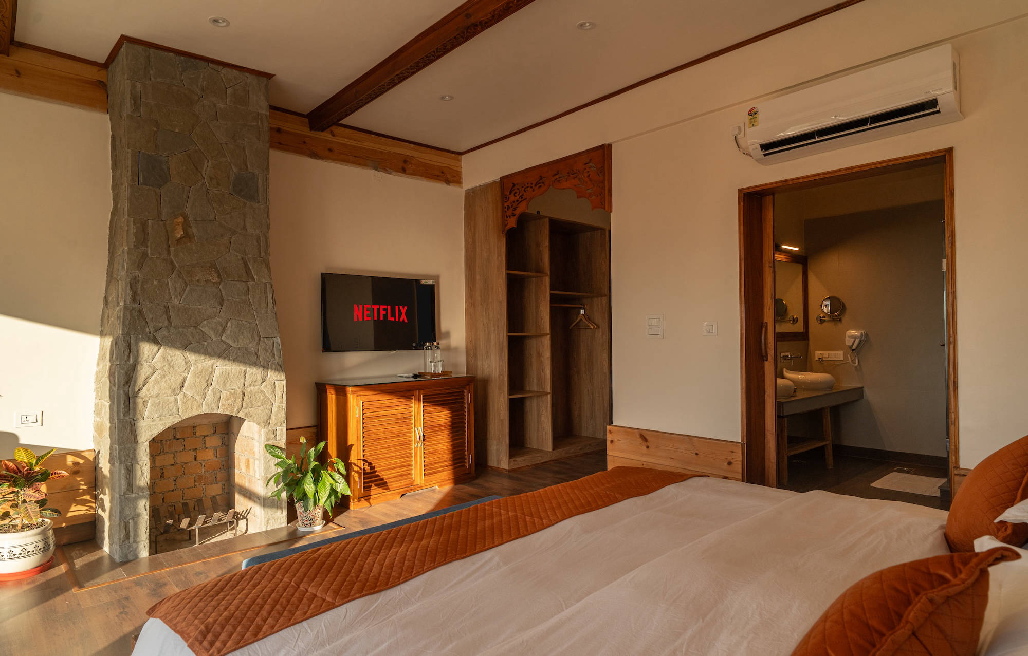 The rooms feature warm wooden flooring, traditional detailing, and a calming natural palette that mirrors the landscape outside. Every room includes a stone-faced chimney, adding a touch of rustic charm and mountain warmth to your stay. The luxurious bathrooms are designed for indulgence, featuring twin sinks, premium fittings and an elegant, spacious layout. A walk-in wardrobe offers ample space and ease for longer stays.